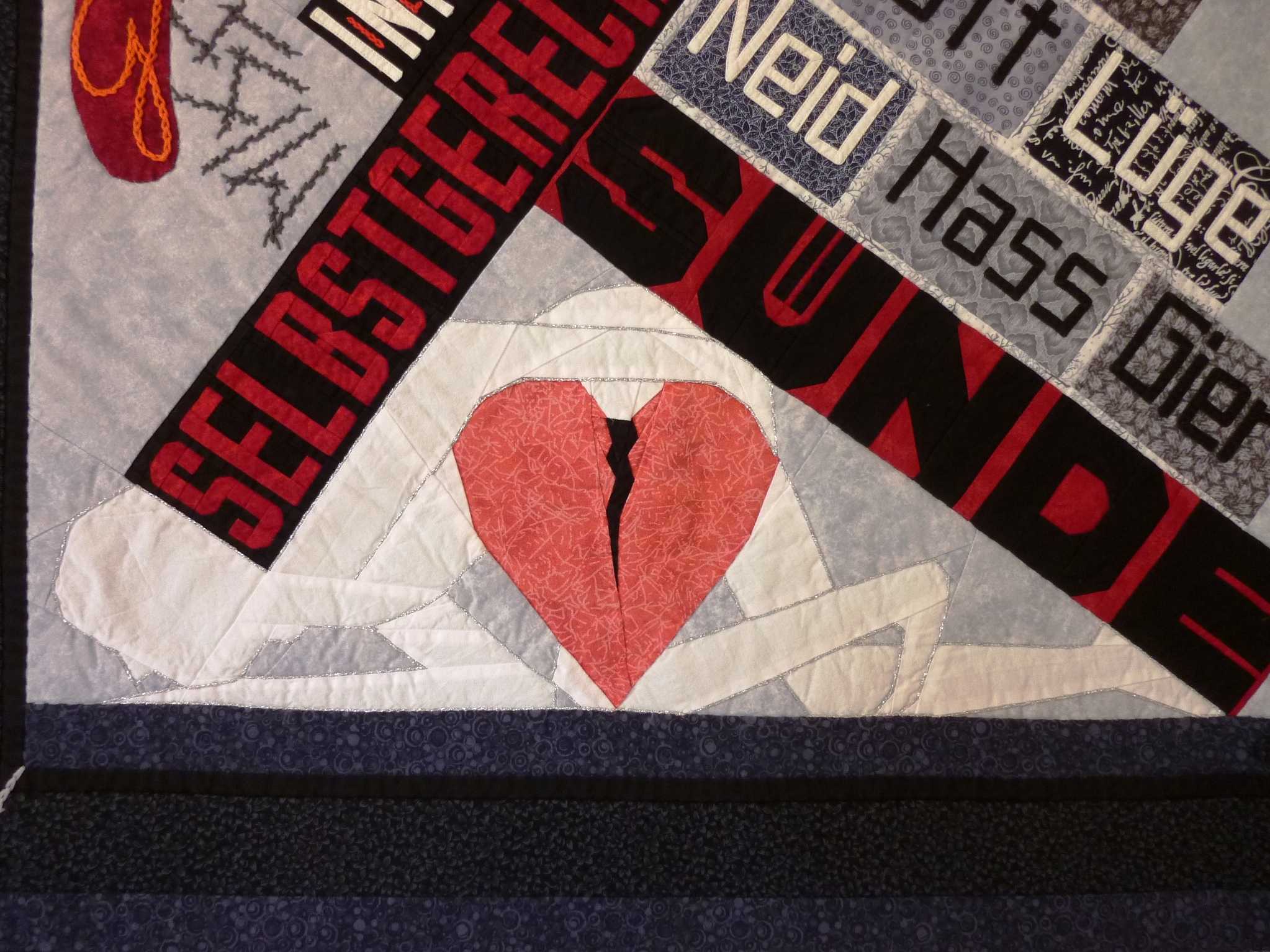Überwiegend mit der Paperpiecing-Methode maschinengenäht, -appliziert, handbestickt und handgequiltet.