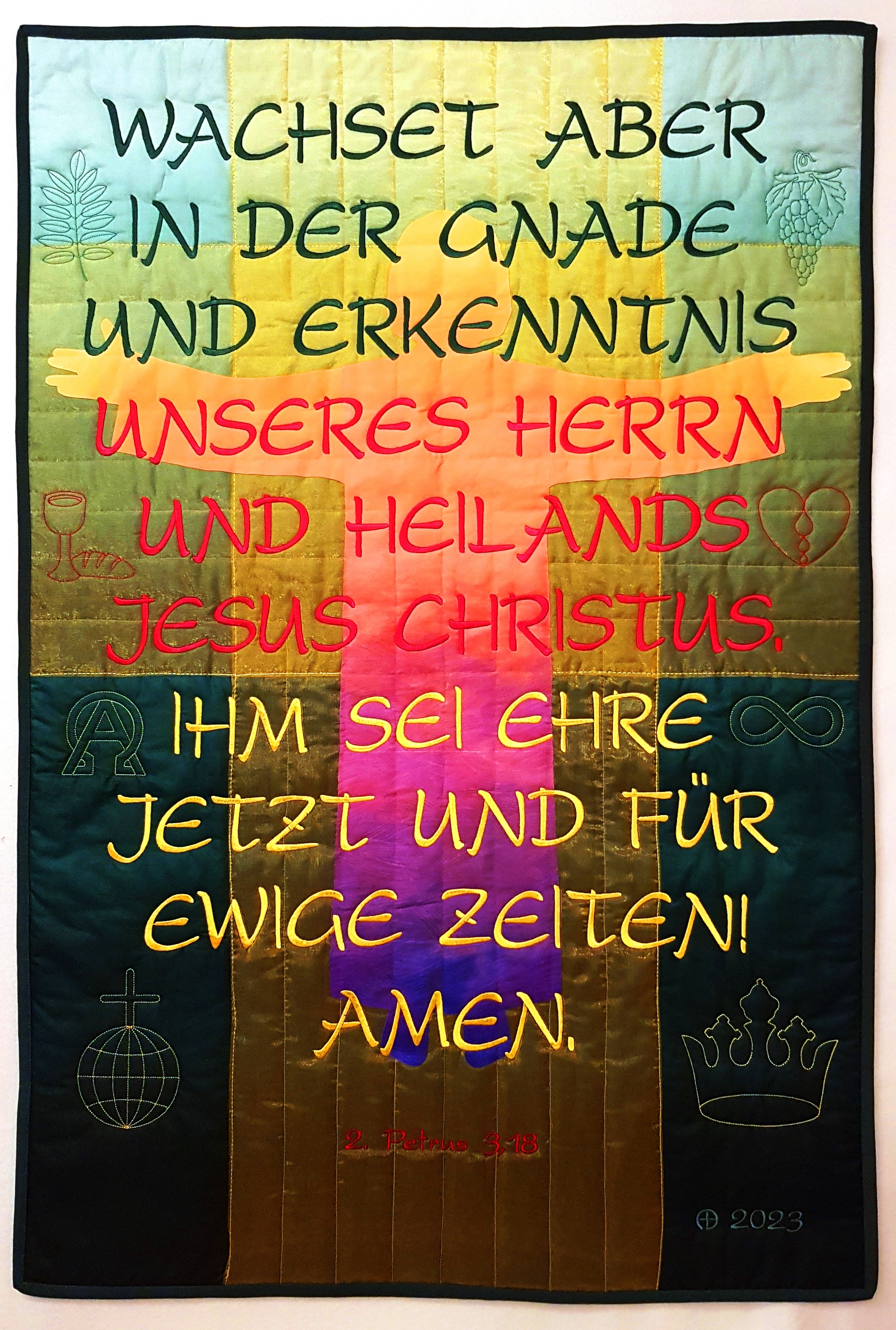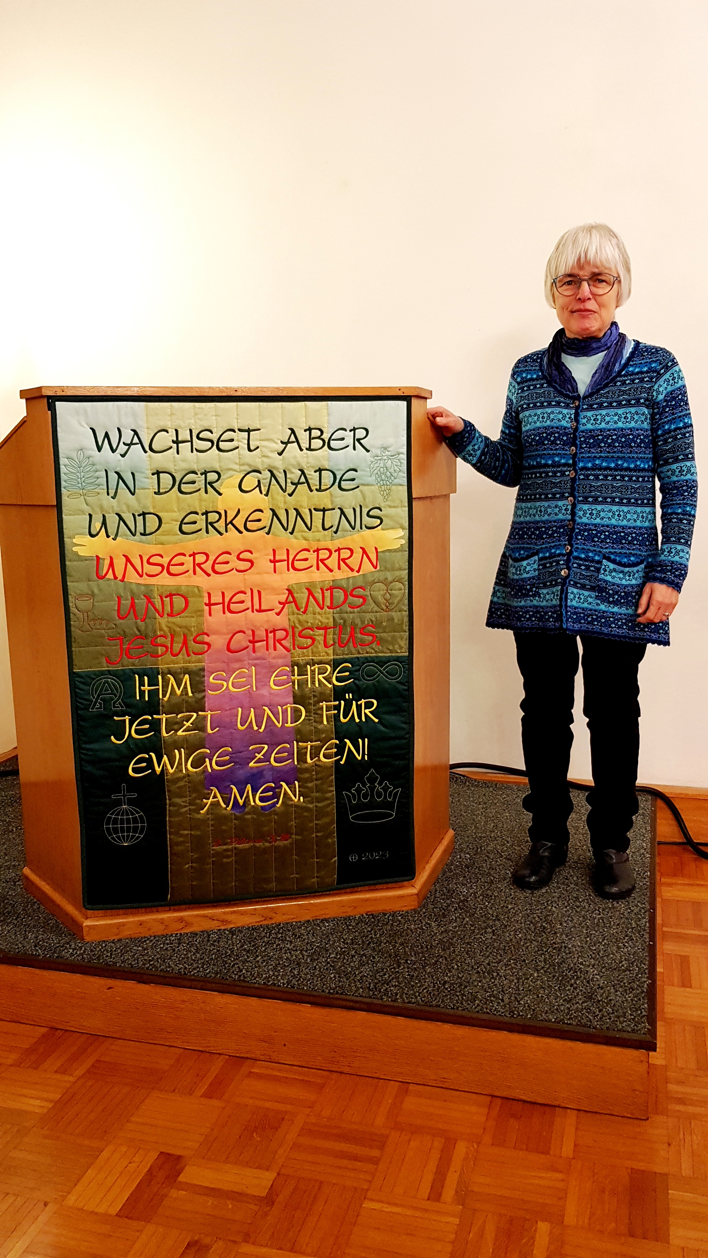 „Die Gnade unseres Herrn Jesus sei mit euch allen!“ war mir zu wenig herausfordernd, deshalb wählte ich den Text aus dem 2. Petrusbrief, K.3,18: