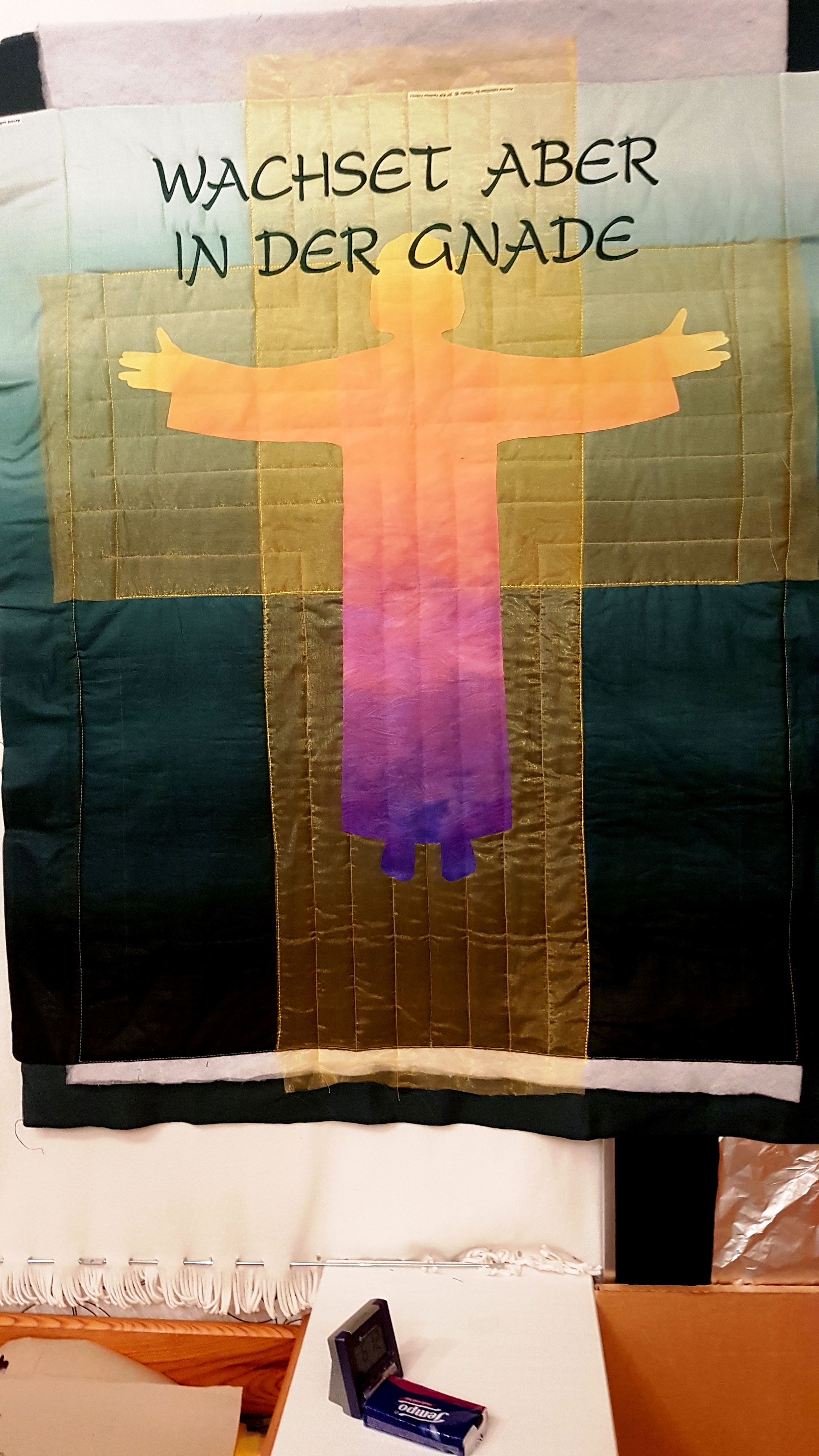 Einen Kanzelbehang zu nähen, bedeutet für mich eine Kombination aus geistlichen Überlegungen und technischen Fertigkeiten, aus Erkundigungen, Planungen und Versuchen einerseits und Gebet um Hilfe und Segen andererseits, und schließlich eine Mischung aus Arbeit und Freude, aus Anspannung und schließlich Dankbarkeit, wenn es gelingt.