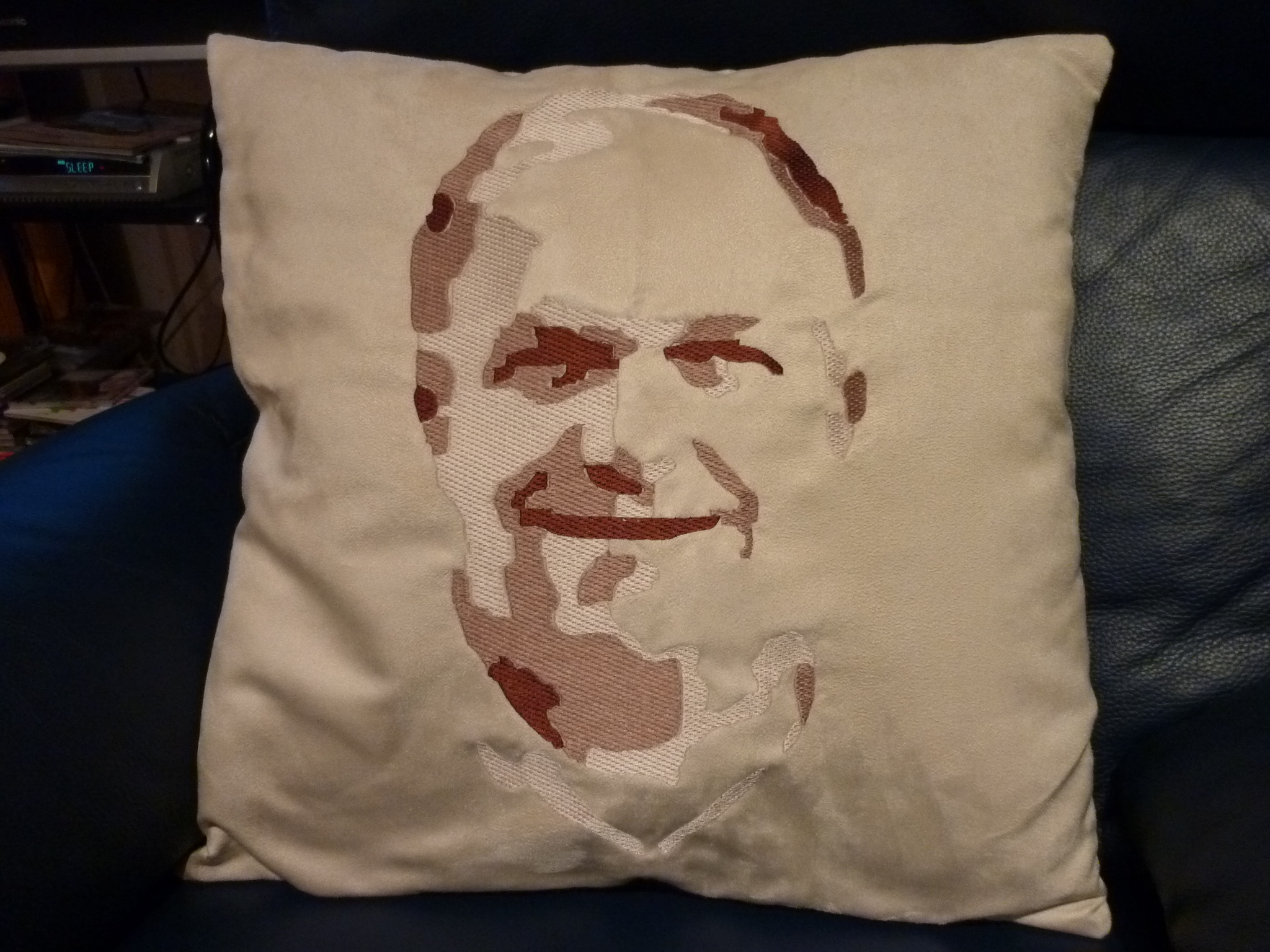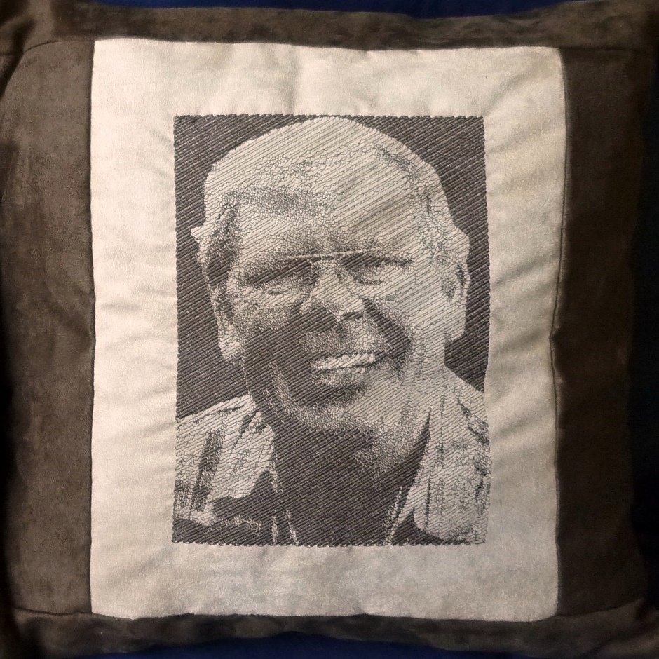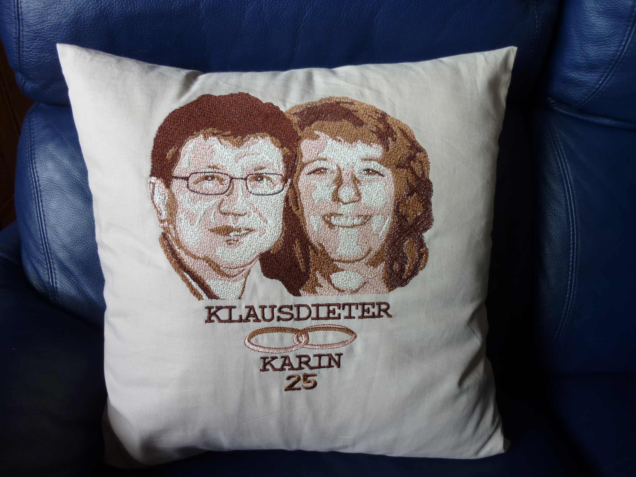 Zum 65. Geburtstag meiner Schwägerin habe ich ein Kissen gestickt und genäht. Links und rechts stehen die Losungen des Tages ihrer Geburt und ihres 65. Geburtstages (im Netz findet man unter dem Stichwort "Losungen" mehr dazu). Für die Mitte habe ich ein Bild aus ihren Kindertagen eingescannt, mit einem Bildbearbeitungsprogramm bearbeitet und dann mit der Stick-Software in eine Stickerei verwandelt.