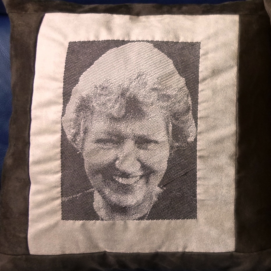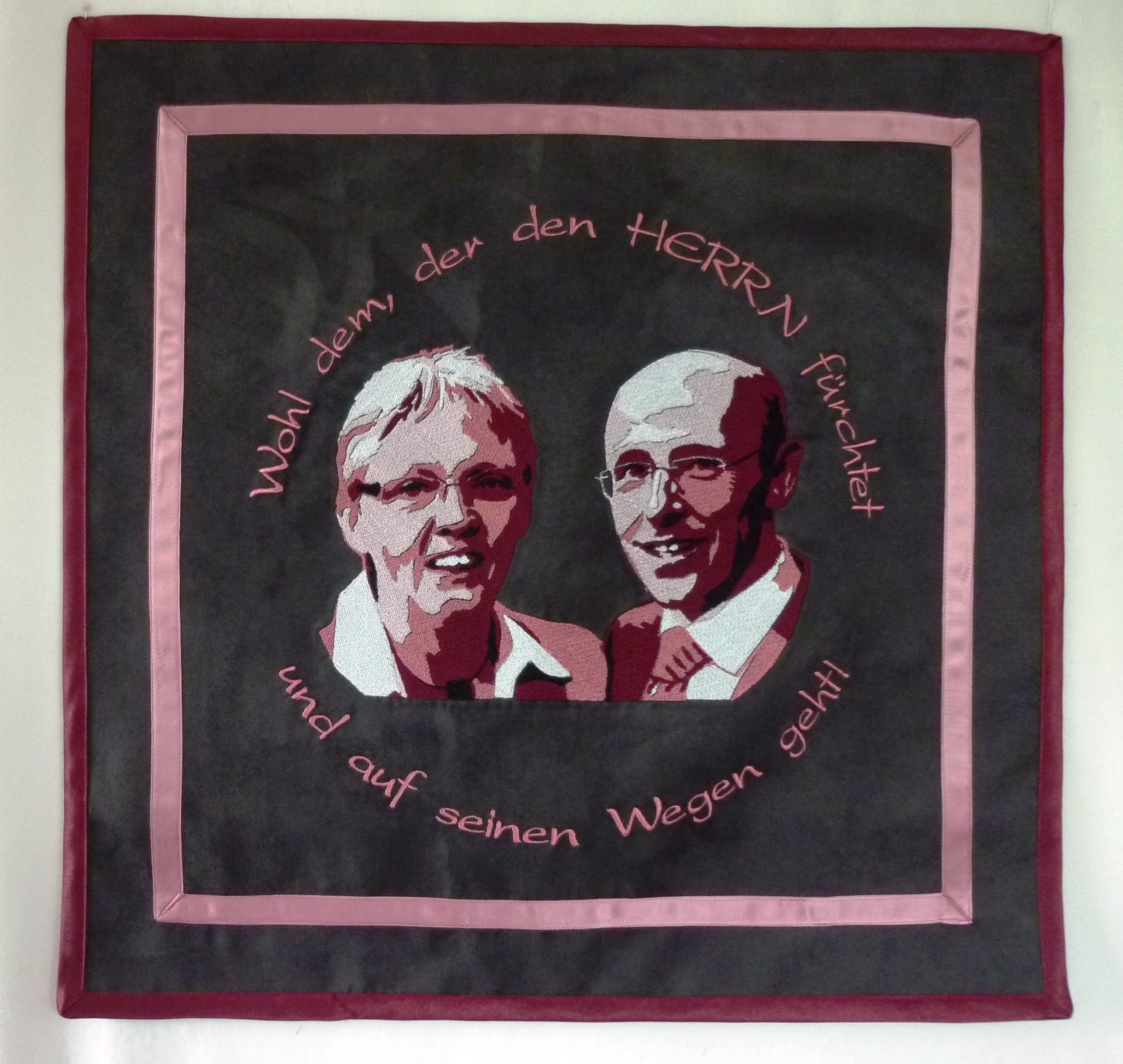 Zum 65. Geburtstag meiner Schwägerin habe ich ein Kissen gestickt und genäht. Links und rechts stehen die Losungen des Tages ihrer Geburt und ihres 65. Geburtstages (im Netz findet man unter dem Stichwort "Losungen" mehr dazu). Für die Mitte habe ich ein Bild aus ihren Kindertagen eingescannt, mit einem Bildbearbeitungsprogramm bearbeitet und dann mit der Stick-Software in eine Stickerei verwandelt.
