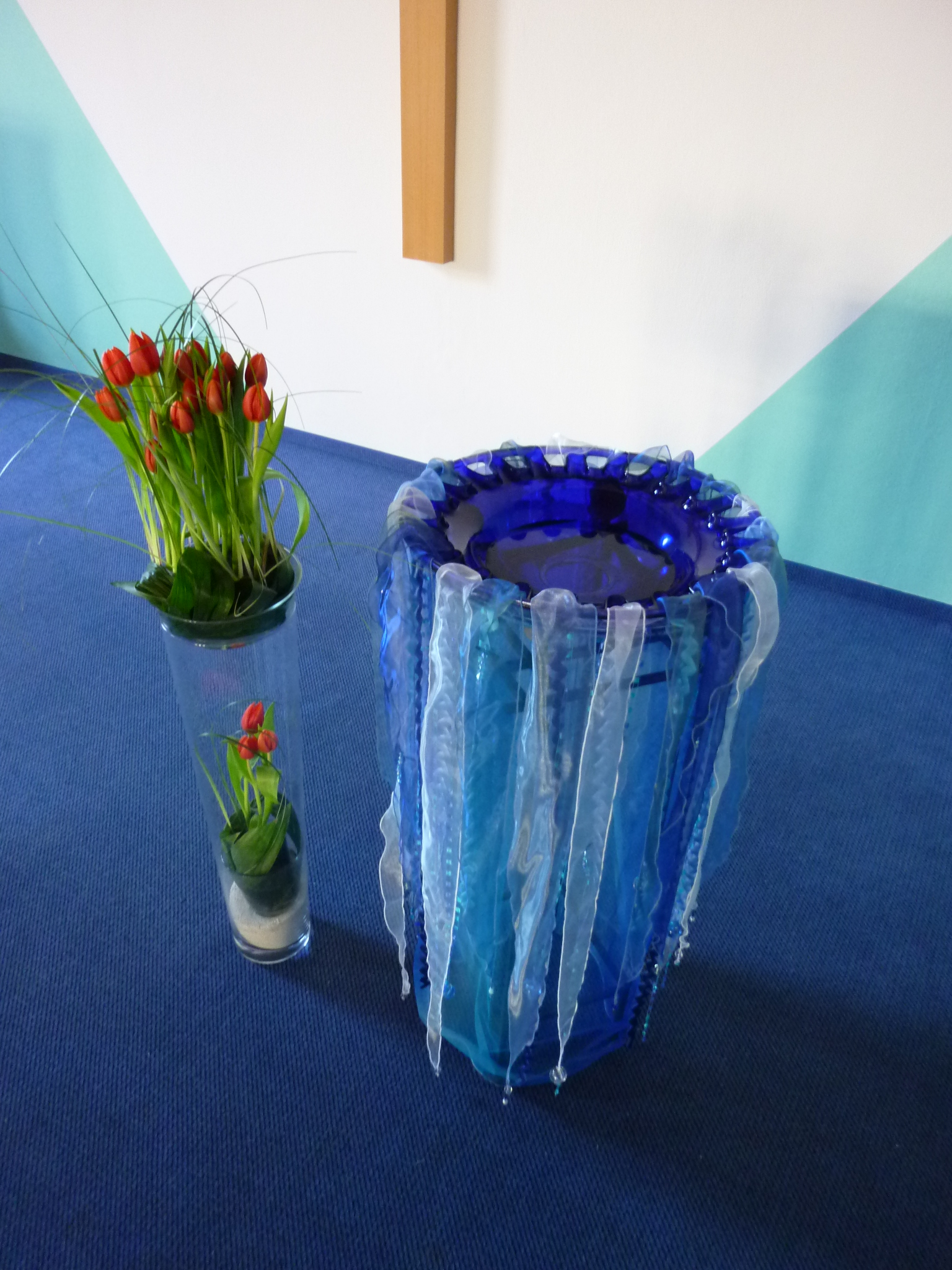 Die Bänder habe ich durch den Lochrand der Glasschale nach oben gezogen, so dass der Eindruck überfließender Fülle